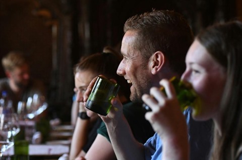 | Les clients d'un restaurant de Katmandou boivent dans des verres fabriqués avec des bouteilles ramassées sur les pentes de l'Everest, le 1er août. |