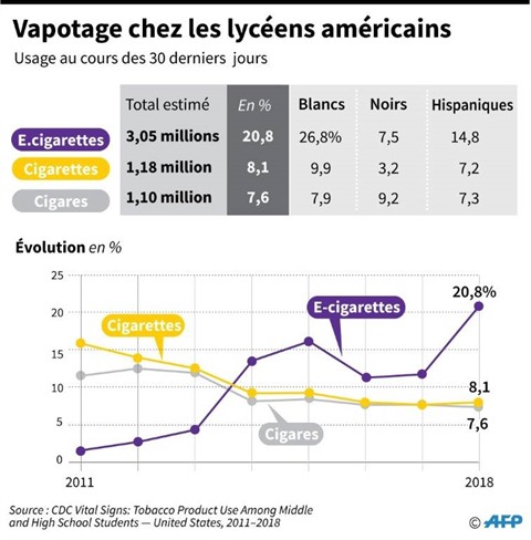 Selon les dernières statistiques officielles, le nombre de jeunes Américains utilisant des cigarettes électroniques a pourtant augmenté d'un million et demi en 2018, mettant à mal des années de lutte contre le tabagisme dans les lycées et collèges.