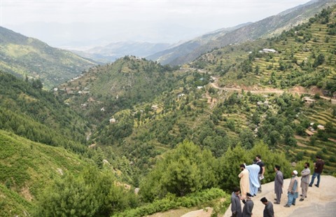 | Des responsables forestiers regardent la progression des arbres plantés autour d'Heroshah, dans la vallée du Swat, le 17 mai au Pakistan. |