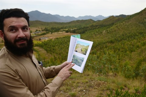 | Pervaiz Manan, responsable forestier, montre des photos de la zone avant le programme de reboisement, le 17 mai à Heroshah, dans la vallée du Swat, au Pakistan. |