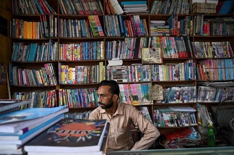 | Un vendeur dans une librairie de Lahore, le 13 août 2020 au Pakistan. |