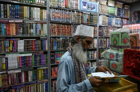 | Un homme lit un livre religieux dans une librairie de Lahore, le 13 août 2020 au Pakistan. |