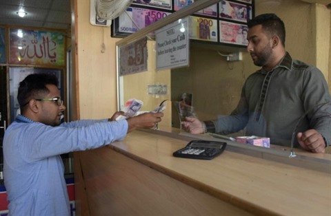 | Un homme britannique (gauche) échange des livres sterling dans un bureau de change de Mirpur, au Pakistan, le 19 octobre 2017. |