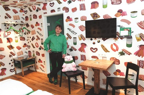 Dans l’étroit lobby de son hôtel, dans lequel il a investi 700.000 euros en travaux de rénovation, le mot "saucisse dispose de ses lettres de noblesse inscrites en plusieurs langues, de la "kolbasa" russe, à la "soseji" japonaise en passant par la "loukaniko" grecque. La décoration intérieure soigne les détails: du porte-manteau imitant les couteaux de boucher aux cochons géants sur les portes en verre poli des toilettes, en passant par les savons en forme de... saucisse.