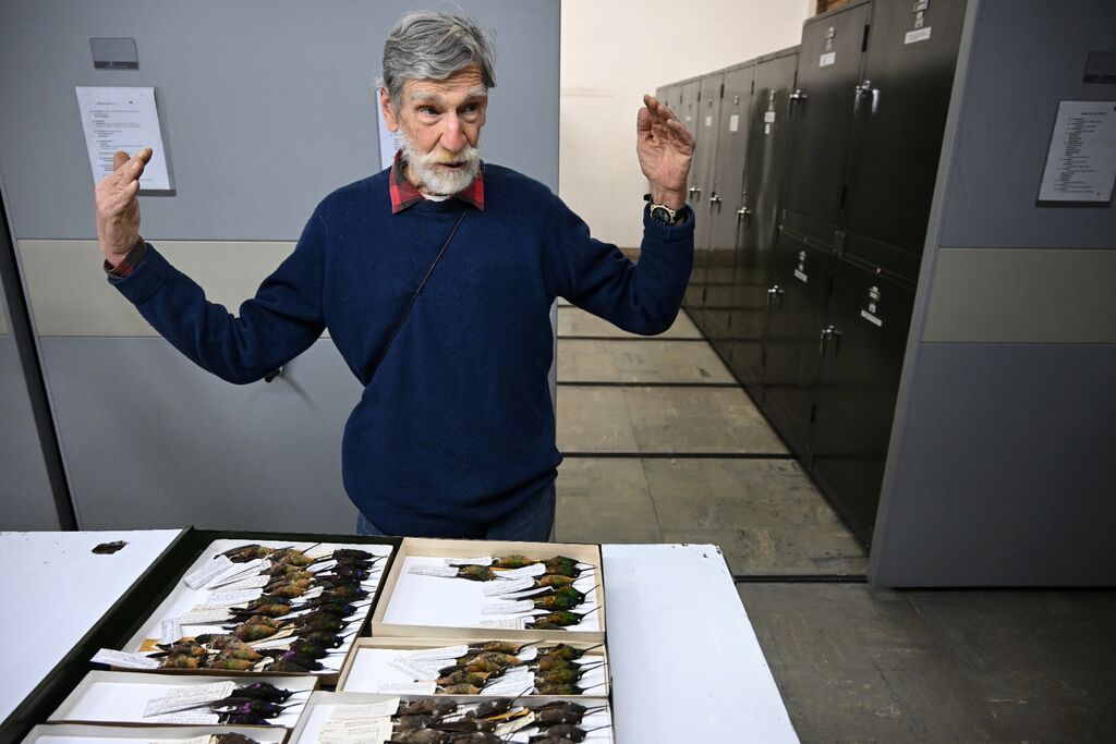 | Gary Stiles, ornithologue et conservateur de l’Institut des sciences naturelles, montre des espèces embaumées au laboratoire de recherche scientifique de l’Université nationale de Bogota, en Colombie. |