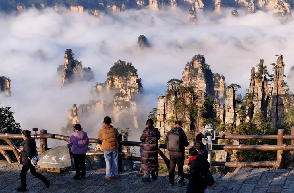 | Des touristes dans le parc forestier national de Zhangjiajie, dans la province du Hunan, dans le Centre de Chine, le 3 janvier. |