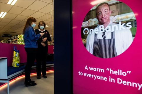 Un comptoir, un distributeur de billets, deux tablettes et deux conseillers : le kiosque de la start-up OneBanks installé dans un supermarché Co-op représente une alternative aux agences traditionnelles à l'heure où celles-ci ferment à tour de bras, victimes d'Internet et de la chasse aux coûts.