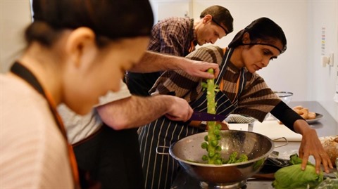 | Des bénévoles de l'association FoodCycle préparent des plats à partir de la nourriture destinée à la poubelle, le 21 décembre. |