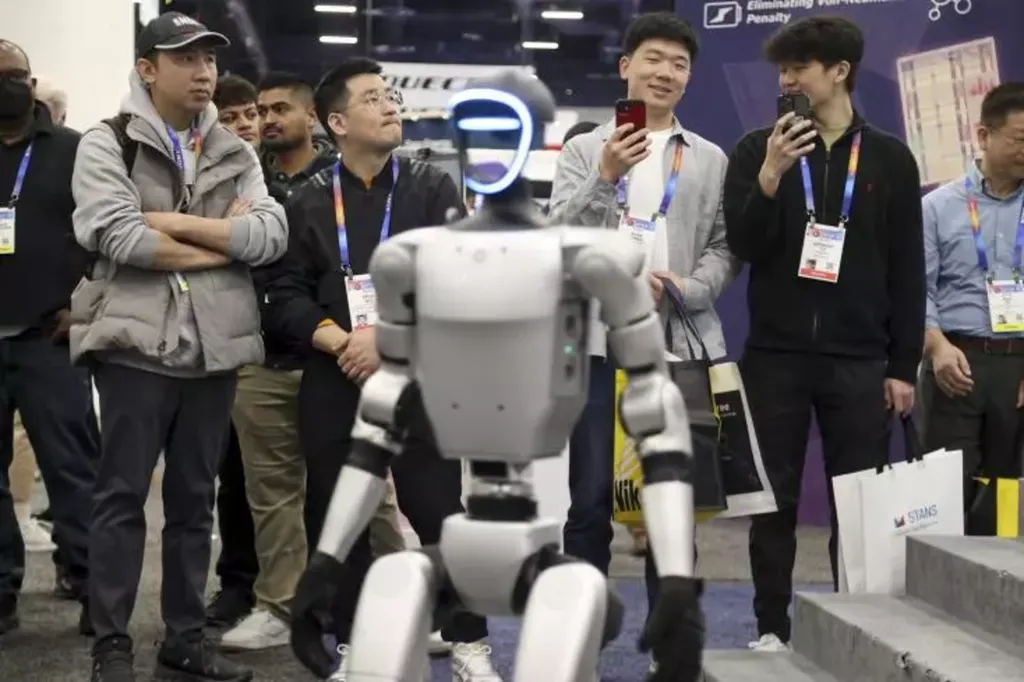 | Participants regardant un robot au salon technologique CES à Las Vegas. |