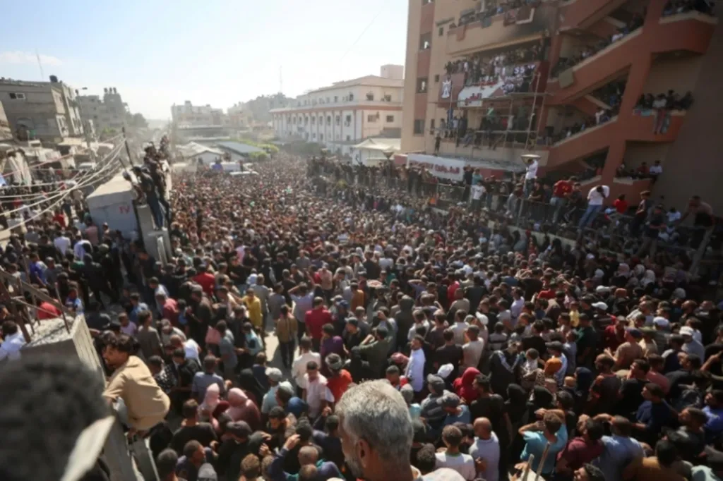 | Des bus transportant des Palestiniens libérés par Israël arrivent au milieu d'une immense foule devant l'hôpital Nasser à Khan Younès, dans le sud de la bande de Gaza, le 13 octobre 2025. |