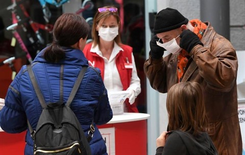 | Des employés distribuent des masques aux clients d'un supermarché à Vienne, le 1er avril. |