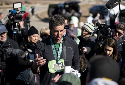 | Beto O'Rourke, candidat à l'investiture démocrate pour la présidentielle américaine, fait une déclaration aux médias après avoir participé à une course, le 16 mars 2019 à North Liberty, dans l'Iowa. |