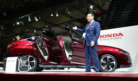 | Le Pdg de Honda, Takahiro Hachigo, présente la "Clarity Fuel Cell", le 28 octobre au salon de l'automobile de Tokyo, au Japon. |
