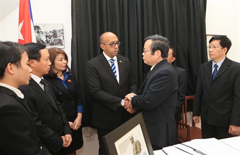 | Le vice-président de l’Assemblée nationale Phùng Quôc Hiên exprime à l’ambassadeur cubain Herminio López Diaz sa grande tristesse après le décès du leader Fidel Castro, le 28 novembre à Hanoï. |