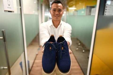 | L'entrepreneur vietnamien Lê Thành montre les chaussures fabriquées à partir de marc de café par sa start-up ShoeX, le 29 juin à Hô Chi Minh-Ville. |