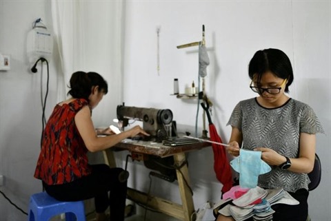 | Bùi Thi Minh Ngoc (d), fondatrice d'une start-up vietnamienne proposant des serviettes hygiéniques écologiques vendues via Facebook, le 23 juin 2020. |