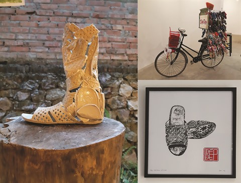 Parlant de ses travaux réalisés durant sa résidence à Bac Ninh, Geralda De Vos se rappelle : "En automne de 2019, je me suis lancée dans mes créations avec ma collection. Je voulais l’approcher à travers différentes disciplines artistiques. J’ai créé le célèbre modèle de +dép tô ong+ en céramique ainsi que des assiettes avec des empreintes de chaussures, référant à l’empreinte écologique de notre alimentation. À côté de la céramique, j’ai également fait une sérigraphie représentant le +dép tô ong+, accompagné par un +cachet d’empereur+ stipulant +dép đep+ (jolie sandale)".