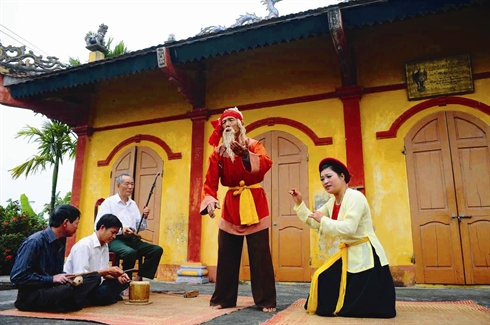 | Des artistes amateurs de la troupe de chèo du village de Khuôc devant la maison de culte des fondateurs de cet art vocal. |