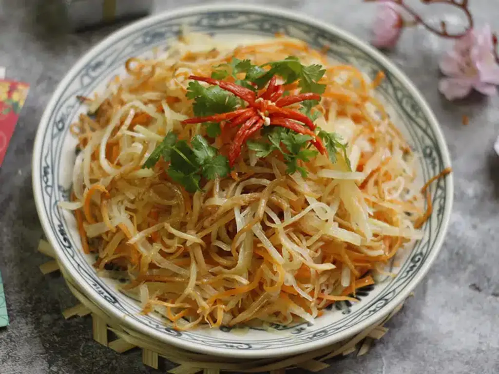 On prépare ensuite du chou-rave frit avec des lamelles de calmar séché. Le chou-rave est coupé en lamelles, étuvé rapidement pour conserver sa fermeté, puis mélangé à des lamelles de calmar grillé, du poulet frit coupé en lamelles, de la purée de porc et des champignons shiitake coupés en lamelles.