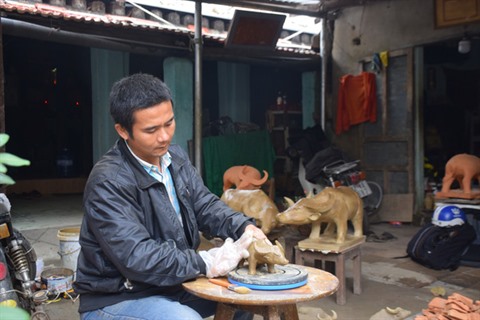 | Nguyên Van Hoàng dans son atelier de production de buffles en argile. |