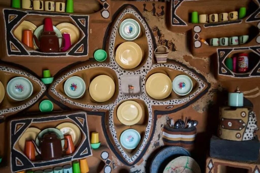 | Des assiettes et ustensiles disposés de manière décorative dans une cuisine en terre peinte à Matobo, le 30 septembre au Zimbabwe. |