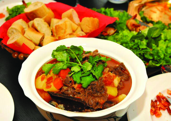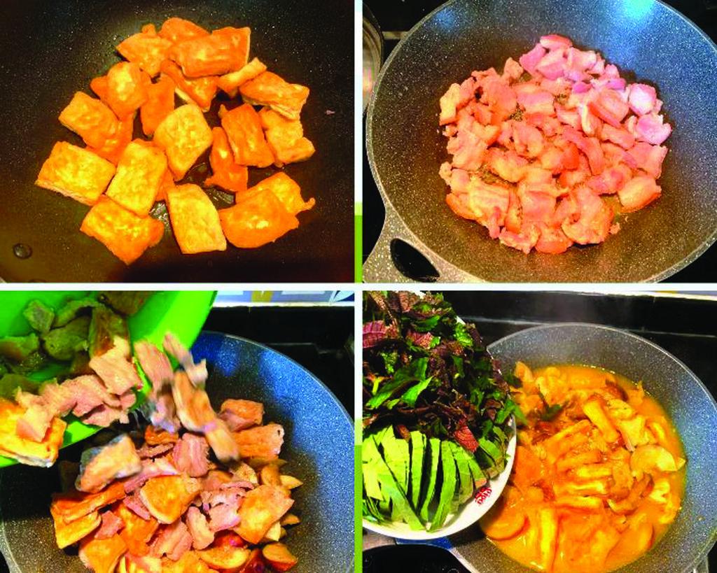 - Poursuivre la cuisson à l’étouffée 5 minutes à feu vif. Rectifier le goût en ajoutant du nuoc mam ou un peu d’eau. Avant la fin de la cuisson, verser les feuilles de lolot et de pérille. Présenter dans une assiette et servir chaud avec du riz blanc.