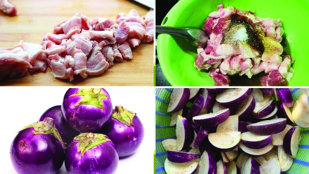 - Dans un wok, à feu vif, verser 1 c.à.s d’huile, puis verser l’ail et mélanger quelques secondes. Verser ensuite les aubergines et 1 c.à.s de nuoc mam, 1/2 c.à.s de cassonade et 1 c.à.s de sauce aux huîtres. Mélanger bien durant 2 minutes. Verser ensuite les morceaux de tofu puis la viande et mélanger l’ensemble. Verser environ 500 ml d’eau et le curcuma pilé.