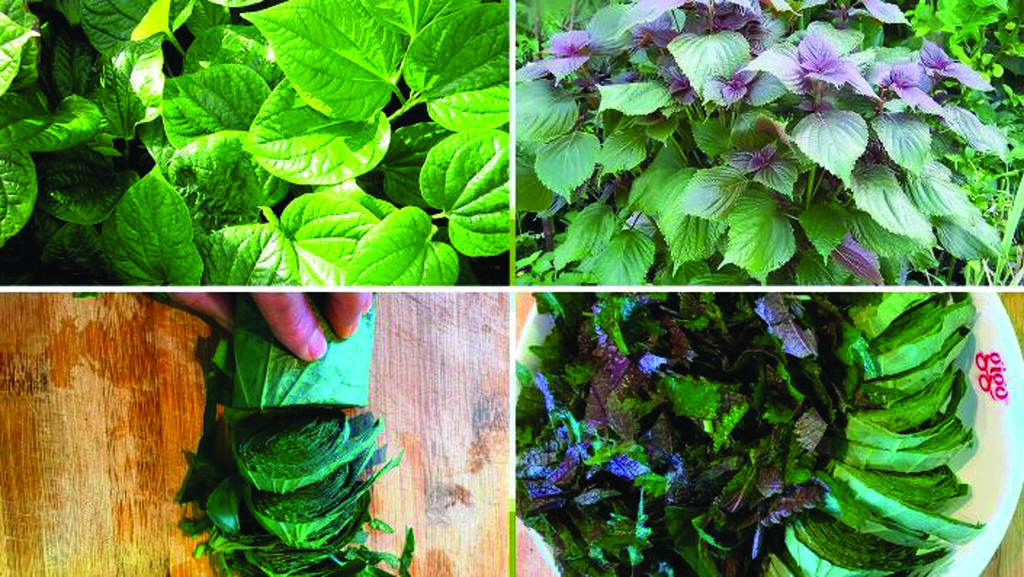 - Laver les feuilles de lolot et de pérille, les égoutter puis les couper finement.