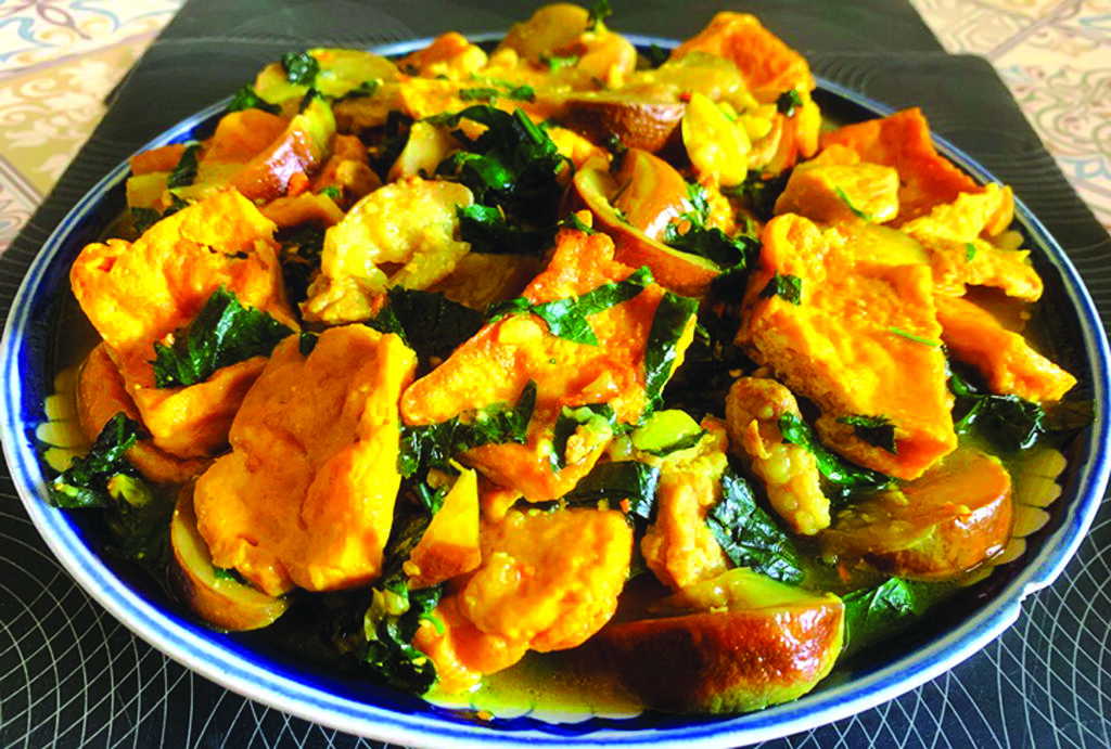 - Dans une marmite, à feu doux, verser 3 c.à.s d’huile puis mettre les morceaux de tofu et les faire dorés. Sortir et réserver.