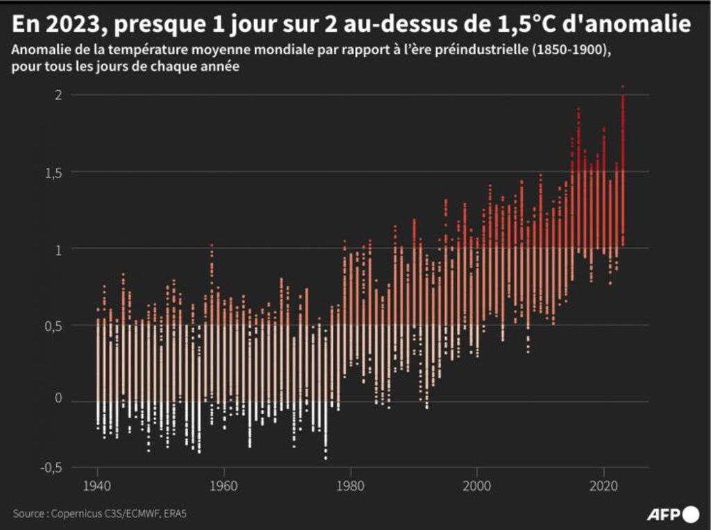 | Écart entre les températures mondiale moyenne de chaque jour et la température mondiale à la même date à l'ère préindustrielle (1850-1900), de 1940 à 2023. |