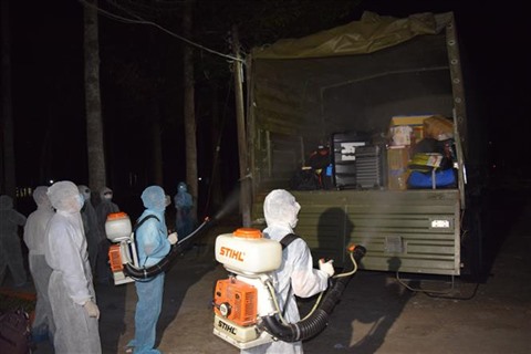 | Désinfection des bagages de citoyens vietnamiens revenant des Philippines, à Dông Thap (Sud). |