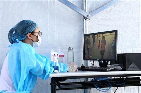 | Une agente de santé surveille la température corporelle des personnes entrant à l’hôpital Bach Mai à Hanoï via un scanner thermique, le 11 mai. |