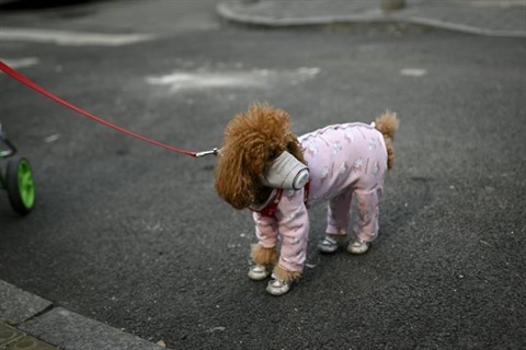 | Des chiens avec un masque dans les rues de Shanghai, le 19 février. |