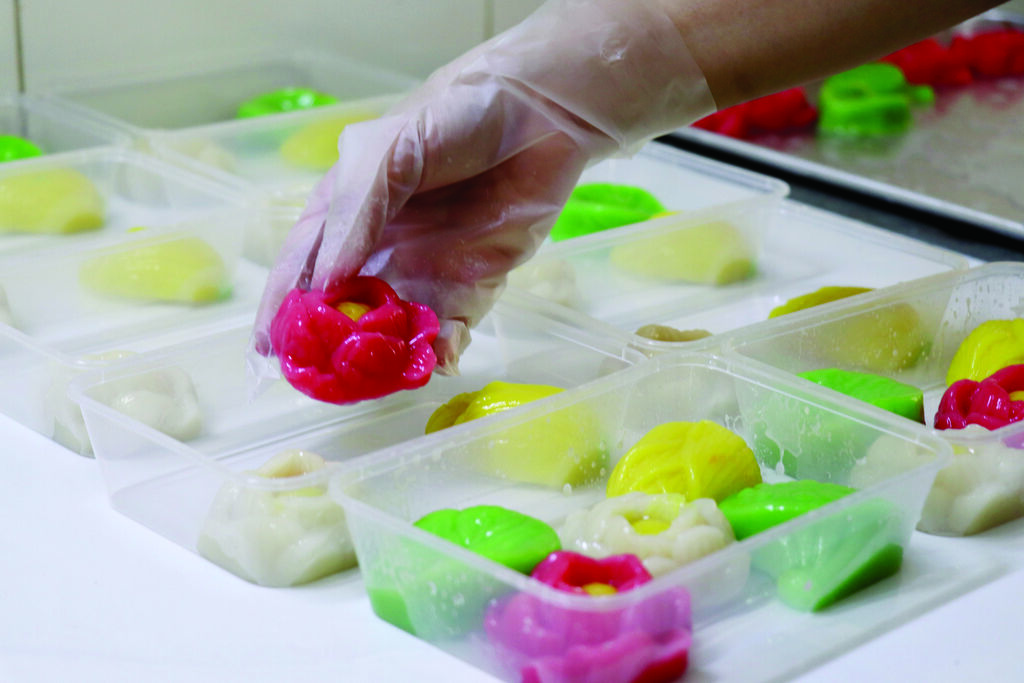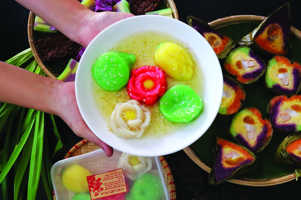 “Ce type de compote liquide sucrée, bien que sa fabrication prend beaucoup de temps, se vend bien les jours de pleine lune. Une fois, mon mari et moi avons dû rester éveillés une nuit entière pour honorer une commande de 2.500 pièces”, raconte-t-elle. Uyên a renouvelé la forme des bánh da lợn traditionnel en créant des carrés bleus et violets placés symétriquement en alternance comme un échiquier, ce qui rend le mets plus attractif. En particulier, la jeune artisane n’utilise que les couleurs naturelles extraites des feuilles de pandan pour obtenir le vert, des fruits de gardénia pour le jaune et de la betterave pour le rose…