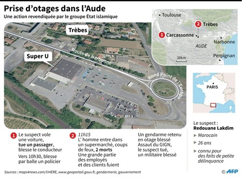 L'assaillant, Redouane Lakdim, 26 ans, a agi "seul", a déclaré le ministre de l'Intérieur Gérard Collomb depuis Trèbes, à moins de 10 km de Carcassonne.
