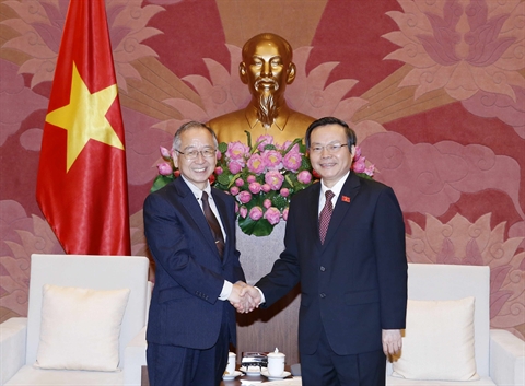 | Le vice-président de l'Assemblée nationale vietnamienne Phùng Quôc Hiên (droite) et le président du Conseil d'audit du Japon, Teruhiko Kawato, le 24 juillet à Hanoï. |