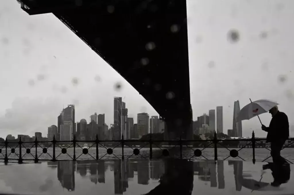 | La ville de Sydney, en Australie, dans la brume, visible à travers les trombes d'eau le 22 mai. |