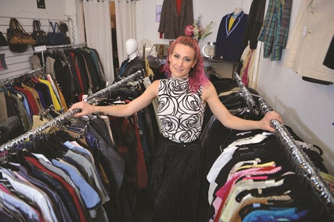 | Sarah Freeman dans sa boutique de prêt de vêtements d’occasion à Sydney. |