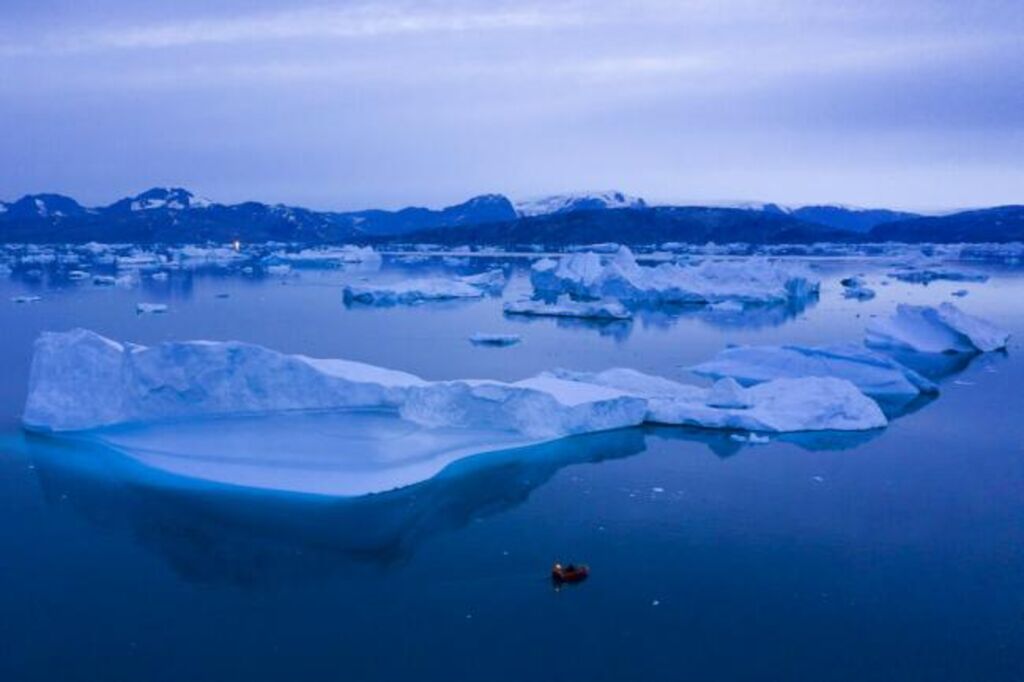 | Un bateau navigue à côté de larges icebergs à Kulusuk, au Groenland, le 15 août 2019. |