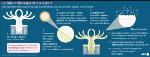 Ce phénomène de dépérissement, qui se traduit par une décoloration, est provoqué par la hausse de la température de l'eau - conséquence du réchauffement climatique - qui entraîne l'expulsion des algues symbiotiques donnant au corail sa couleur vive.