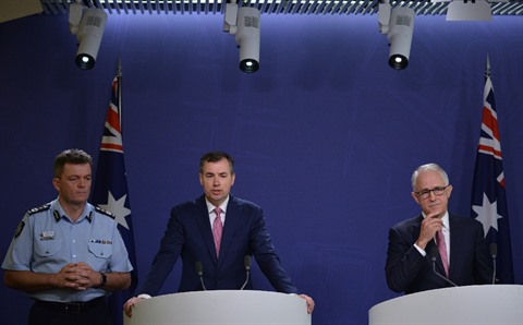 | Andrew Colvin, commissaire de la Police fédérale australienne (gauche), Michael Keenan, ministre australien de la Justice (centre), et Malcolm Tumbulla, Premier ministre australien, lors de la conférence de presse le 23 décembre. |