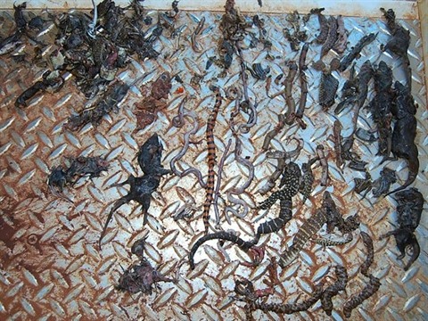 | Photo non datée fournie le 25 juin par l'Université du Queensland, en Australie, montrant les cadavres de reptiles tués par un chat errant. |