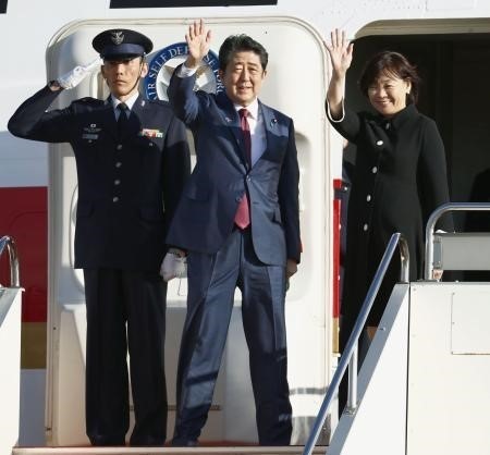 | Le Premier ministre japonais Shinzo Abe (Centre) à l'aéroport Haneda à Tokyo. |