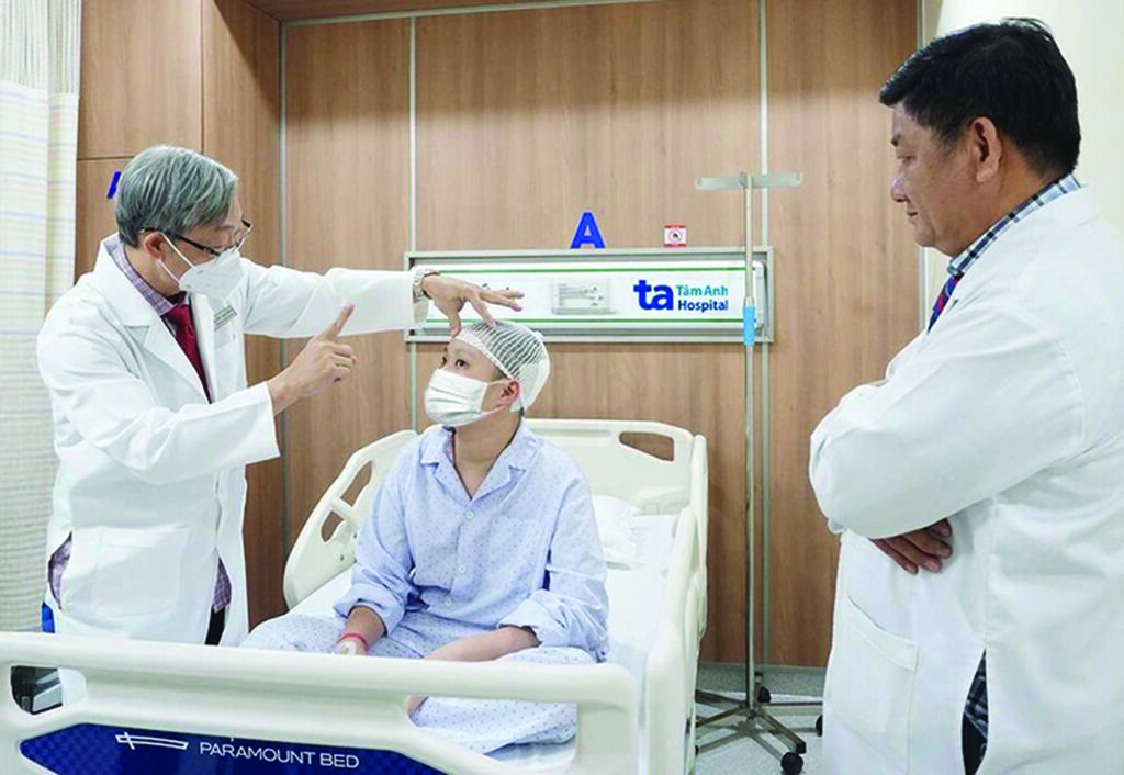 | Les docteurs vérifient le processus de rétablissement d’un jeune patient opéré d’une tumeur cérébrale par robot intelligent, à l’Hôpital général Tâm Anh. |