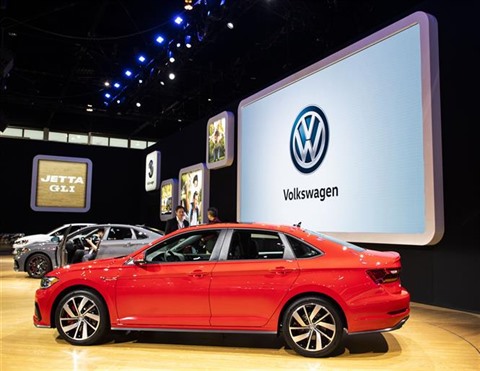 | Des voitures de Volkswagen exposées au Salon automobile à Chicago, en février 2019. |