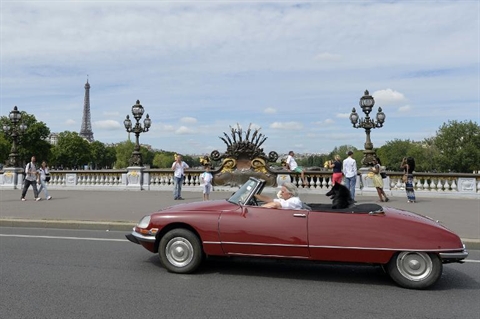 | Une Citroën DS décapotable lors d'un rassemblement de voitures anciennes, à Paris. |