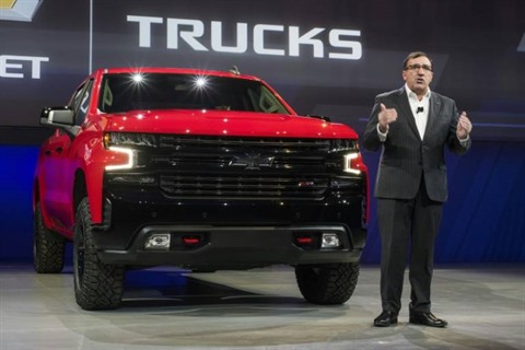 | Le président de General Motors Amérique du Nord, Alan Batey, devant la nouvelle version de la Chevrolet Silverado, à Detroit le 13 janvier. |