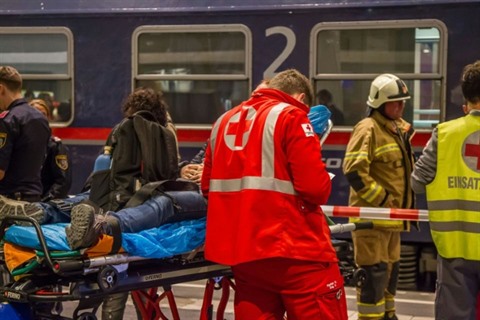 | Des équipes de secours prennent en charge les blessés après une collision entre deux trains en gare de Salzbourg, le 20 avril en Autriche. |