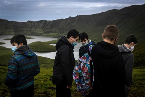 | Des enfants, le visage masqué, durant une promenade sur l'île de Corvo aux Açores, le 11 mars. |