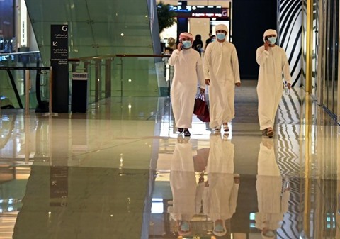 | Des Émiratis portent des masques de protection au Dubail Mall qui a rouvert le 28 avril. |